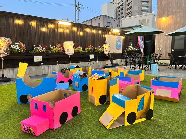 鍛冶町の城東閣にこどもたちの遊び場が出現し、まちピクカラーの段ボール製レンタカーに乗って遊べます。また、アニメ上映の時間もありますので、ぜひ遊びにきてください。