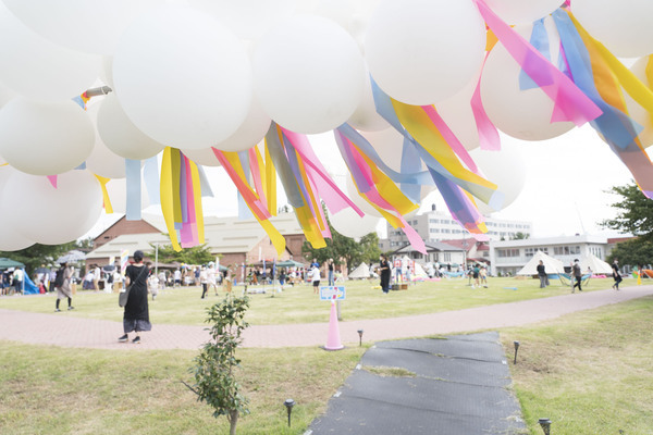 浮き輪でできたまちピクドームが広場に登場。17日にはブランデュー弘前FCが参加型アトラクションをご用意しています。
