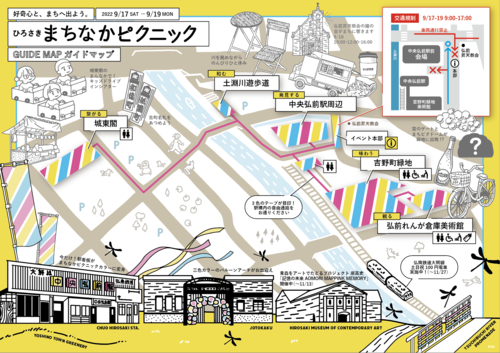 場所:吉野町緑地、弘前れんが倉庫美術館、中央弘前駅周辺、土淵川、城東閣