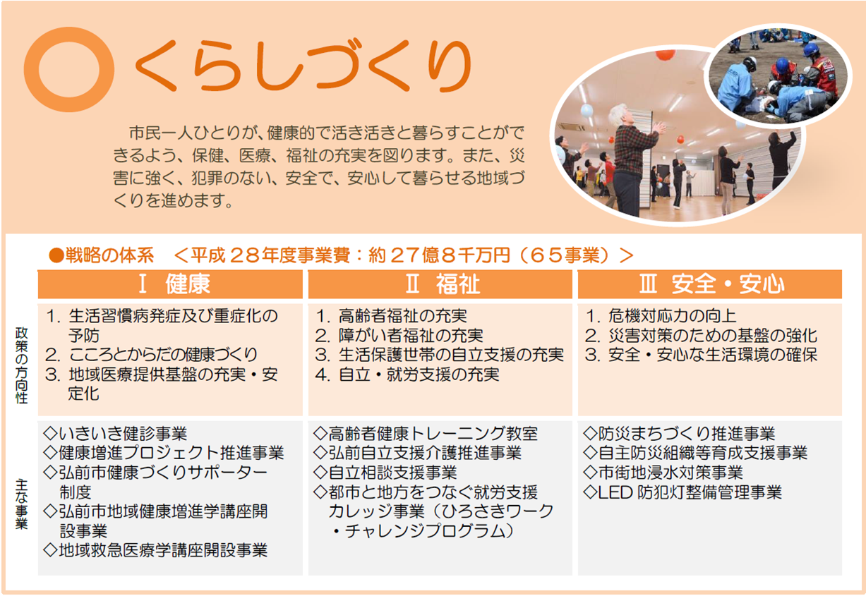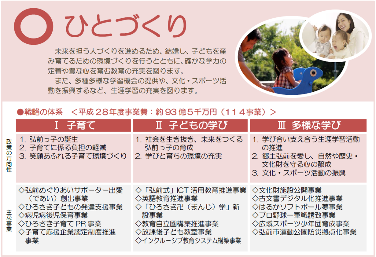 「弘前市経営計画」では、市の取り組みを分野(ひとづくり、くらしづくり、まちづくり、なりわいづくり)ごとに分けて掲載していますが、今回は「ひとづくり(子育て、教育、文化・スポーツ等)(856KB)」にテーマを絞って会議を進めていきます。