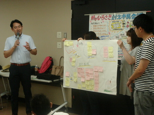 グループワークの発表では、「学校教育・社会教育・生涯教育といった教育全般と連携して、くらしづくりに取り組んでほしい」「医療保健福祉等の知識、理解が深まると、市民は施設や制度を有効にかつ積極的に利用できるようになる」「運動するとサービスが受けられたり、口コミを増やすなど、運動を始めるきっかけづくりが大事」という意見に共感を持った参加者が多かったようです。