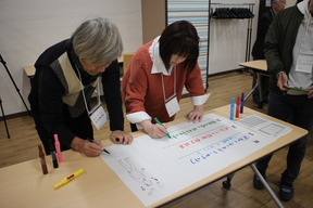その後のグループワークでは、弘前の「好きなところ」と「もう一歩のところ」というテーマで、35名の参加者はそれぞれグループに分かれて話し合いをしました。弘前が大好きな皆さんとだけあって、積極的な話し合いで盛り上がりました。
