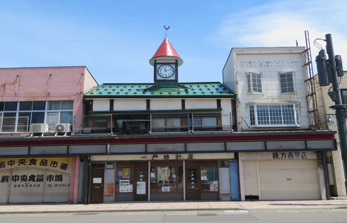 <沿革> 【明治32年】神保時次郎により神保時計店として開業。 【明治42年】現存する時計塔を設置。 【明治末~大正初期】神保時計店閉店、蓬莱橋脇で仙台三原堂時計店支店を営んでいた西成田軍三郎氏に店舗譲渡。西成田氏は親方町の時計商川村喜三郎氏に依頼し、時計塔を一面から三面に改造。 【大正9年】下土手町で営業していた一戸時計店が西成田氏より店舗譲り受け、移転開業。 【昭和39年】道路拡張並びにアーケード設置により道路側の一部を撤去し、時計塔を現在の位置に移設。 【平成25年】交通事故により店舗部分破損、修復。