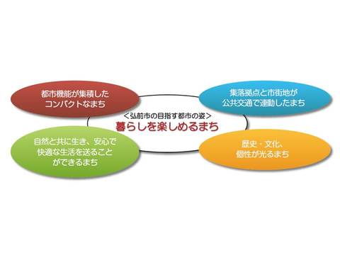 弘前市では、少子化・高齢化・人口減少の進行や経済・雇用情勢の低迷、加えて平成23年に発生した東日本大震災などの大きな社会環境の変化に対応し、また、国や地方自治体の厳しい財政状況などの社会情勢の急激な変化に対応するため、これまでの拡大成長を前提としたまちづくりから、中心市街地活性化、医療や福祉の充実、交通体系、安心・安全な生活環境の整備や、歴史的な街並み・景観の保全といった課題など、環境問題も含めて都市の持続可能性を高めるまちづくりへの転換が求められているところを踏まえ、平成26年度を初年度とする弘前市都市計画マスタープランを策定しました。