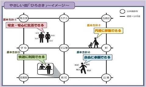 市では、誰もが快適で、安全・安心に暮らせる街の実現に向けて、市民・事業者・行政がそれぞれ取り組むべき方向性を示した指針となる、やさしい街「ひろさき」づくり計画を策定しました。