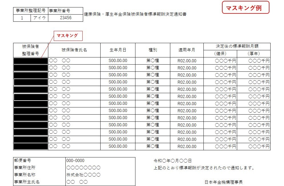 入札・契約手続きにおいては、技術者等の雇用関係が確認できる書類として健康保険被保険者証の写しや被保険者標準報酬決定通知書の写しなどを提出いただく場合がありますが、あらかじめ以下の項目についてマスキング処理を施したうえで提出くださいますようお願いいたします。