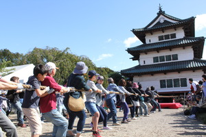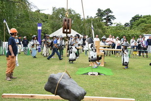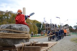 参加者がロープを引き、力を合わせて天守を動かしました。