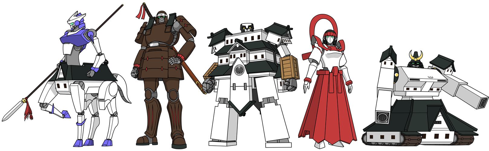 すると、子ども達の願いは天に届き、高岡城(弘前城)・大浦城・堀越城・和徳城・石川城それぞれの城(又は跡地)に雷が落ち、長年弘前を守ってきた城神が城ロボとして復活した。