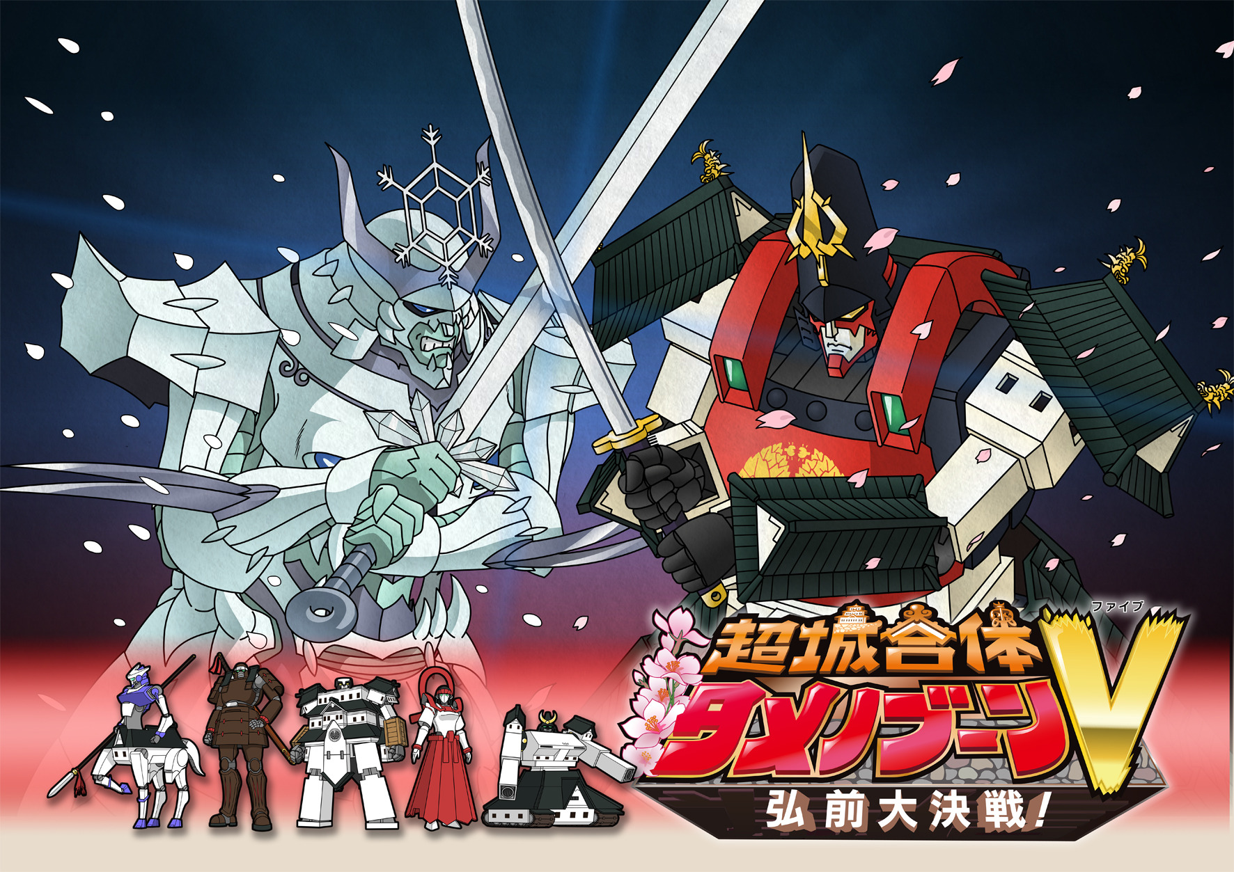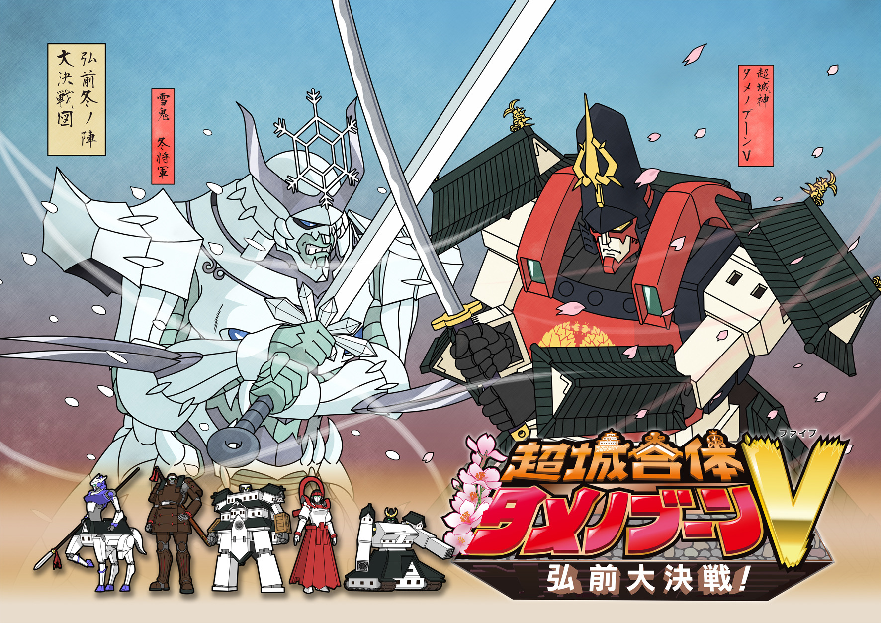 弘前のお城や歴史に親しめるコンテンツとして、弘前の5つの城が合体する巨大ロボ「超城合体タメノブーンⅤ」が誕生しました。