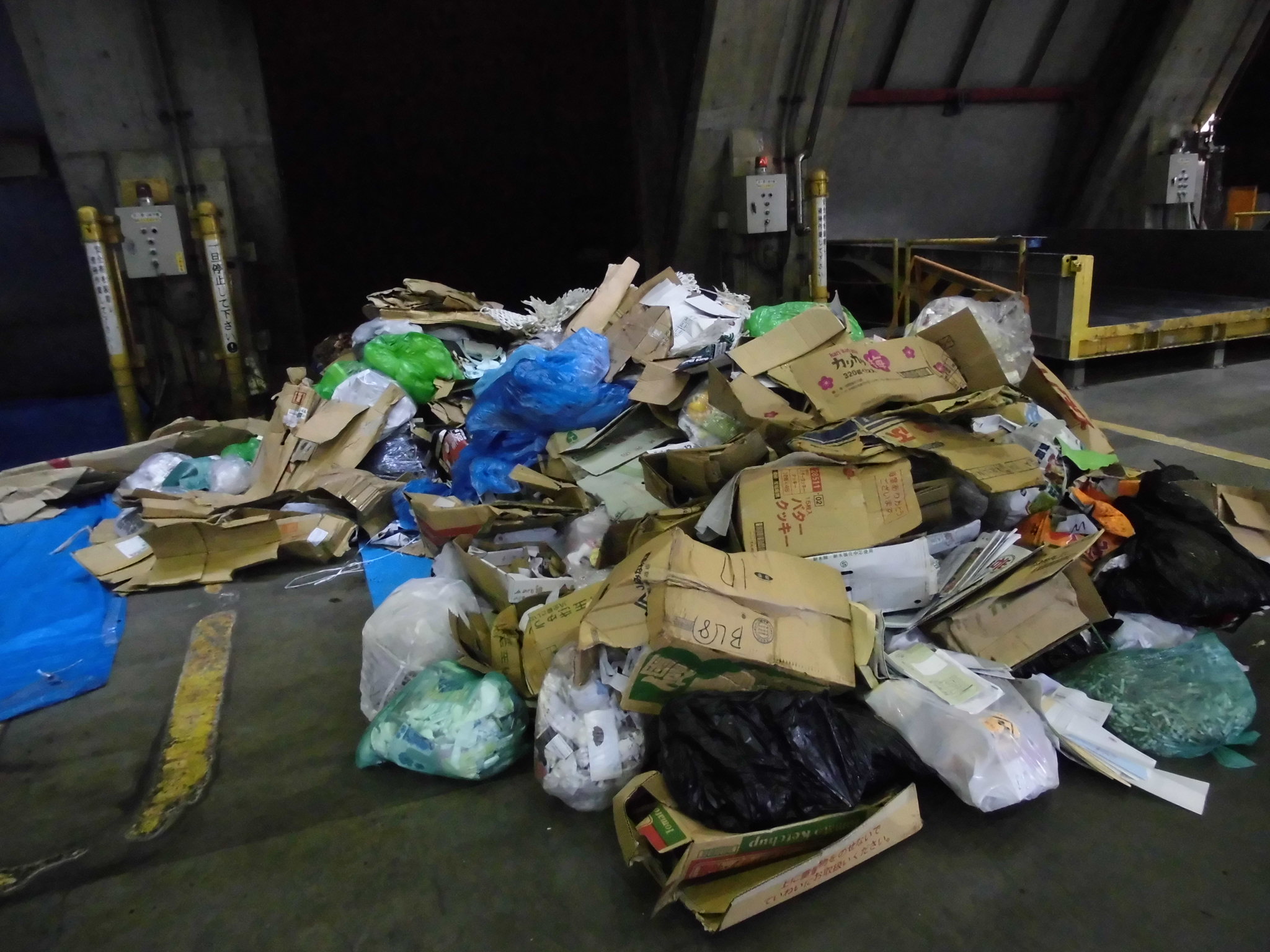 焼却施設に搬入された事業系ごみの展開検査を随時実施し、リサイクル可能なダンボールや書類などの古紙類が大量に混入されている場合に、排出事業者等に指導等を行います。