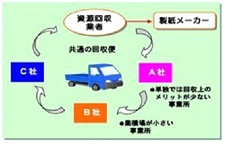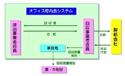 「オフィス町内会」とは、複数の事業所が協力し合い、共通の回収便を事業所間に運行することで、古紙回収業者の運送費に見合うように、量的、コスト的にメリットを生み出す方式です。
