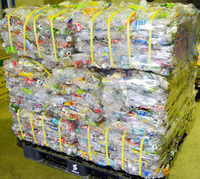 | ▲弘前地区環境整備センターで圧縮・こん包されたペットボトル。ラベルがついているものが多数含まれている |
