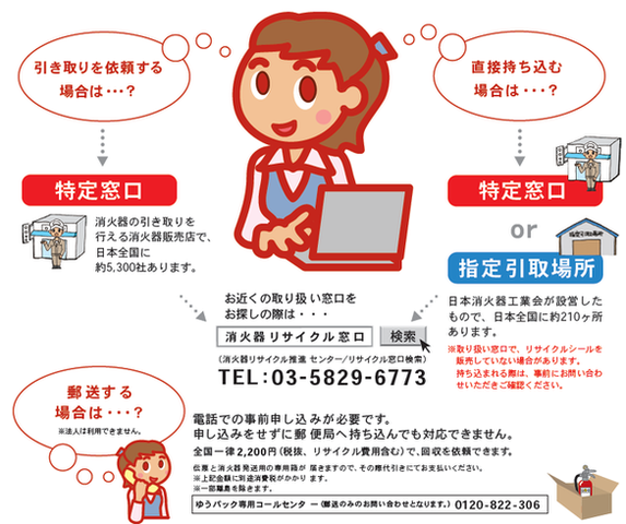 市では消火器の収集を行っていません。消火器は、(一社)日本消火器工業会が地域の販売代理店等と協力して実施している廃消火器リサイクルシステムにより処分してください。(処分には消火器リサイクルシール代及び運送・保管費用が必要です。)