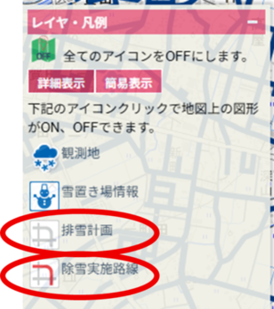 拡幅・排雪予定を確認するためには、拡幅・排雪レイヤを「ON」にする必要があります。