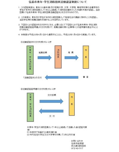 この制度では、青年及び学生が本市の消防団員として地域社会の貢献に努めたことを市長が認証し、「弘前市青年・学生消防団員活動認証状」及び「弘前市青年・学生消防団員活動認証証明書」を交付しています。