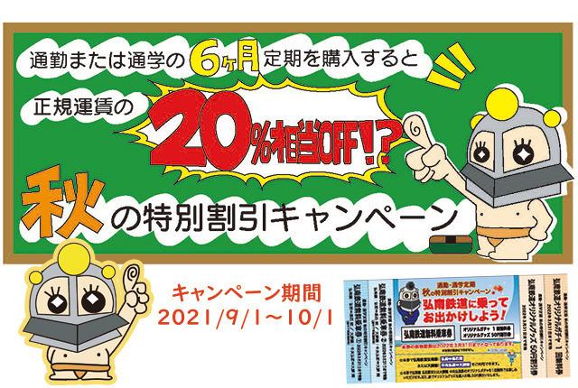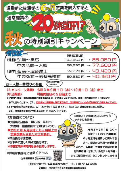 弘南鉄道株式会社では、令和3年9月1日(水)から、通勤・通学6ヶ月定期券を