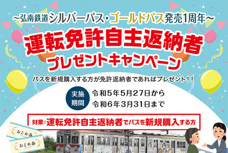 対象者 :運転免許自主返納者で弘南鉄道シルバーパス又はゴールドパスを新規購入する方