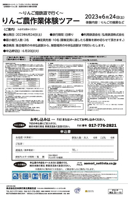 申込み方法:FAXまたはメールにて(株)日本旅行東北青森支店へ申込み