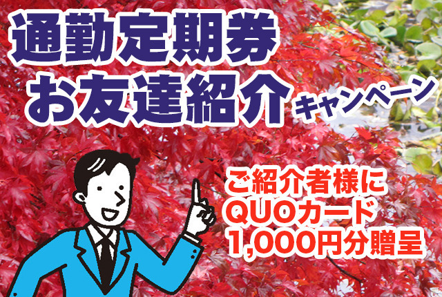 内容 :通勤定期券(1ヶ月・3ヶ月・6ヶ月定期)を新規購入の際、1,000円分のQUOカード
