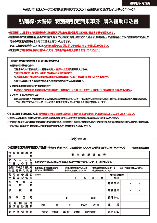 利用方法:キャンペーンチラシ(通学6ヶ月定期券用)の裏面の購入補助申込書を記入の上、