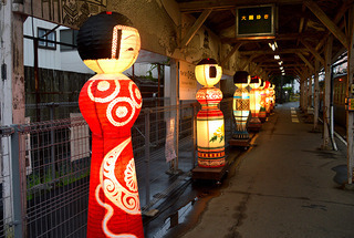 大鰐線・弘南線の主要駅では、こけし灯ろうの特別展示・夜間ライトアップを実施中です。