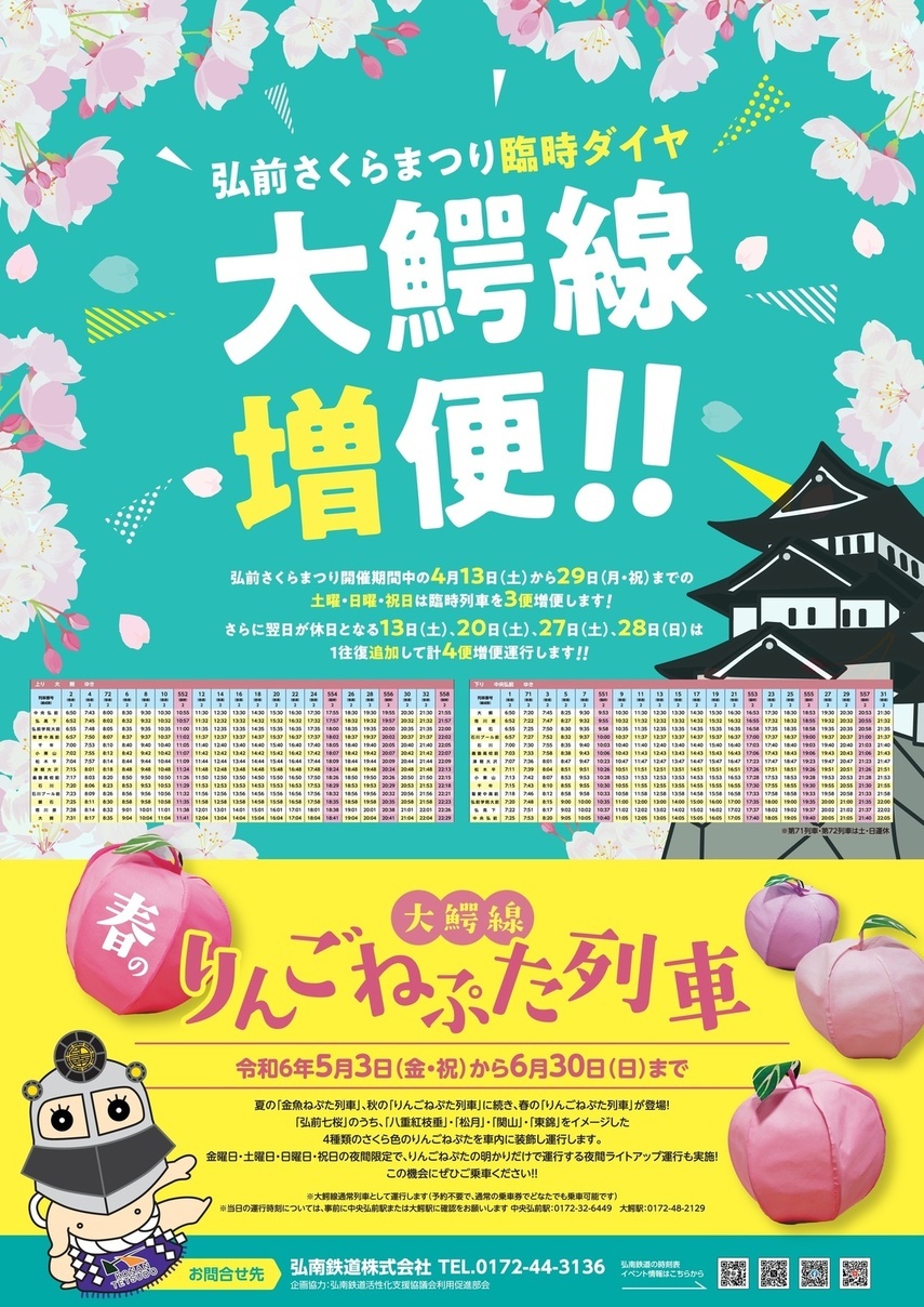 また、大鰐線では弘前さくらまつり開催期間中の4月13日(土)から29日(月・祝)までの土曜日・日曜日・祝日限定で臨時列車を3便増便します!