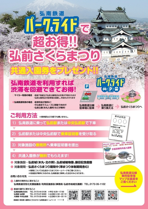 この機会に、無料駐車場をご活用いただき、弘南鉄道を利用して、お得に快適に弘前さくらまつりを楽しもう!