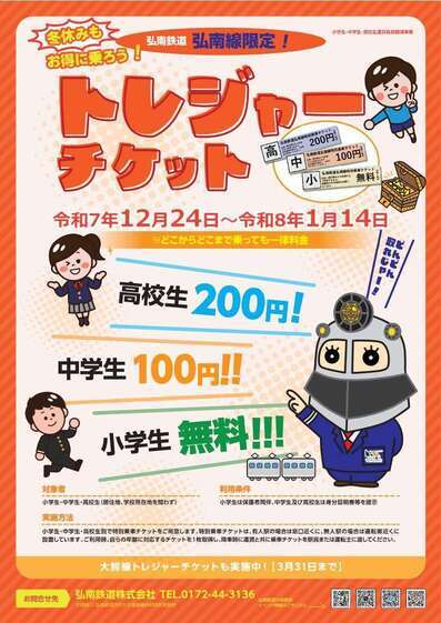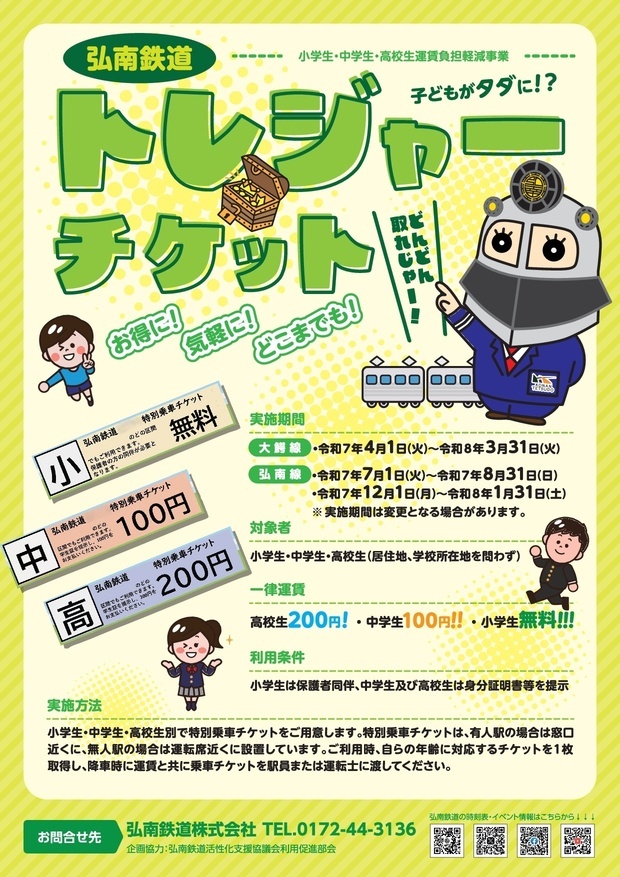 弘南鉄道株式会社では、弘南鉄道活性化支援協議会利用促進部会と連携し、小学生から高校生までの乗車運賃を一律にすることで、お得にたくさんご利用いただくため、昨年度に引き続き、運賃負担軽減事業(トレジャーチケット)を実施します。