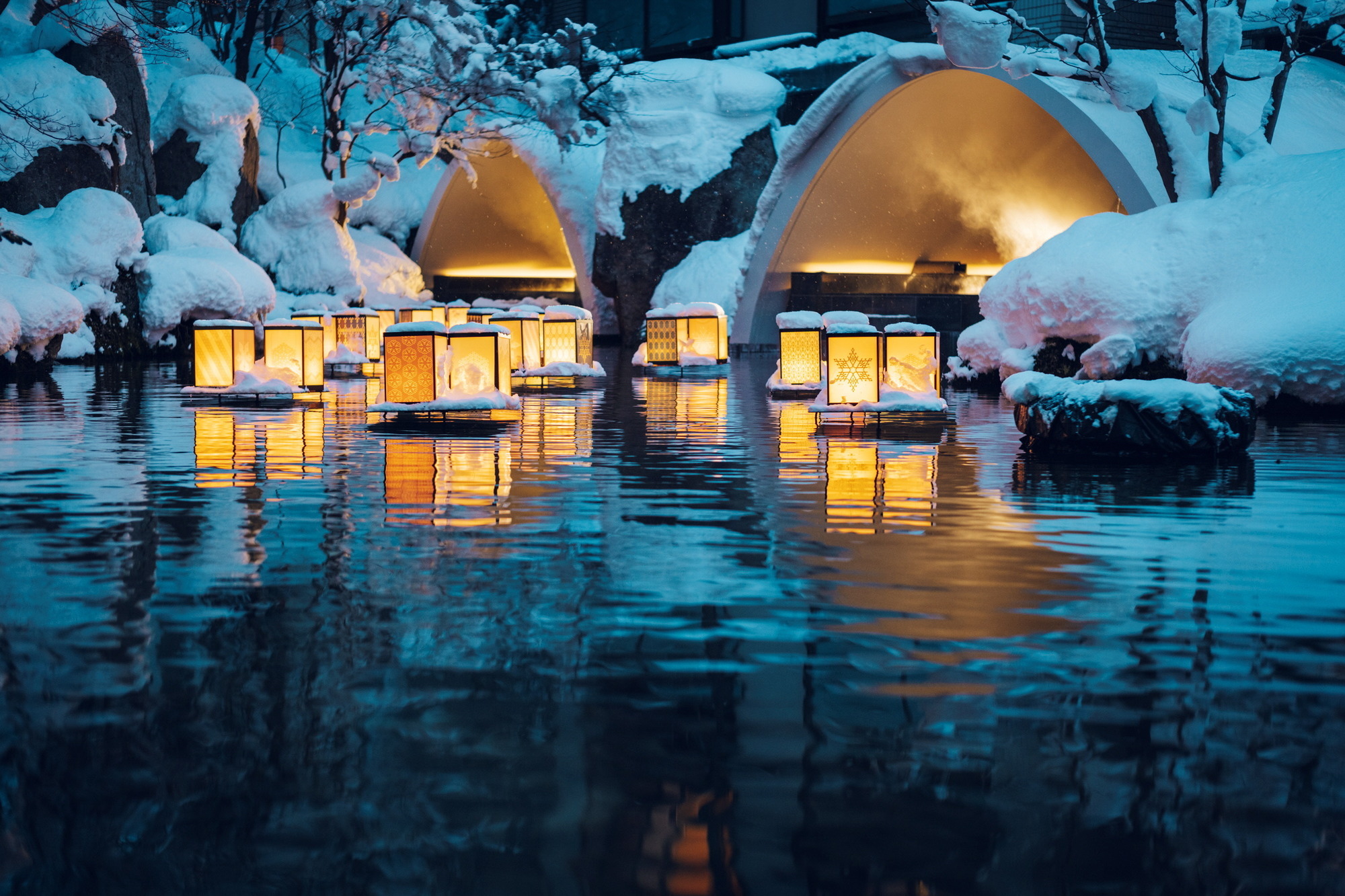 津軽七雪こぎん灯篭列車の運行期間中は、「界 津軽」において、湯船を囲うようにアーチ型の屋根が付いた「かまくら露天風呂」の水庭に津軽七雪こぎん灯篭を浮かべるとともに、津軽四季の水庭に設えた七雪かまくらにも津軽七雪こぎん灯篭が灯るイベントも実施されておりますので、この機会に弘南鉄道大鰐線に乗車し、幻想的な冬の津軽の雰囲気をお楽しみください!