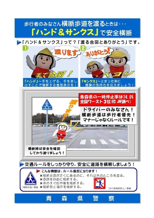 青森県警察では「ハンド&サンクス」を進めています。信号機の無い横断歩道等を横断する際は、手を上げて運転者に横断する意思を伝えたり、横断中も周りに気を付けるようにしましょう。
