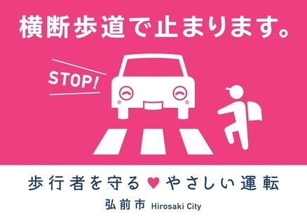 製作したシートは弘前市の公用車に掲示するとともに、弘前市交通安全対策連絡会の団体に配布し、横断歩道歩行者優先を促す啓発活動に活用しています。