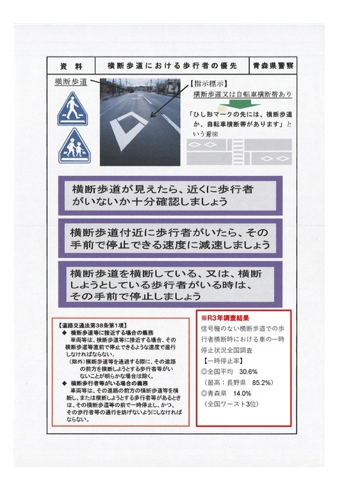 (一社)日本自動車連盟が行った「信号機のない横断歩道での歩行者横断時における車の一時停止状況全国調査」(R6.8実施)によると、青森県は59.9%と全国17位、東北六県では3位という結果になりました。(全国平均53.0%、全国1位:長野県87.0%)