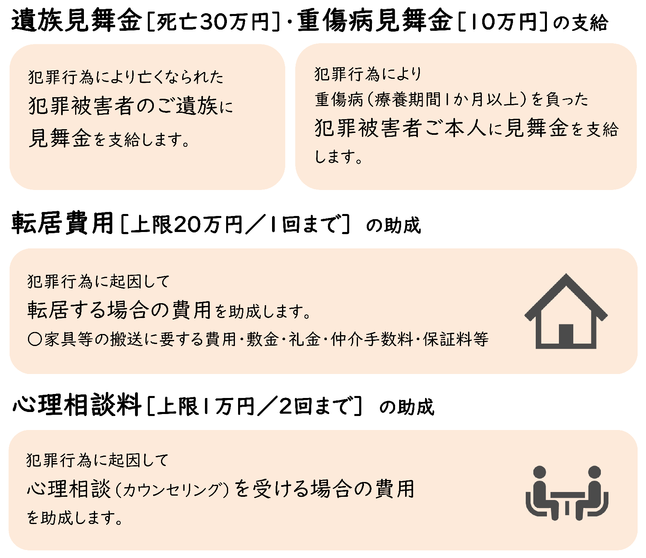 見舞金の支給、転居費用・心理相談料の助成を受けるには、被害事実が客観的に確認できること、犯罪被害者と加害者との間に親族関係がないこと等の要件がありますのでご相談ください。