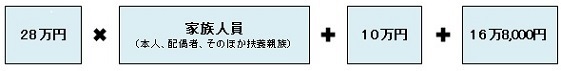 家族人員(本人と同一生計配偶者、扶養親族)の数に28万円をかけた金額に26万8千円(10万円+16万8千円)を加えた金額