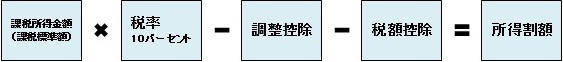 所得割額は、課税標準額に税率10パーセント(市民税6パーセント、県民税4パーセント)をかけた金額から、調整控除額と税額控除額を差し引いて求めます。