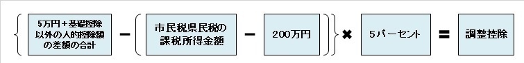 市民税・県民税の課税所得金額から200万円を差し引いた金額を、人的控除額の差額の合計から差し引いた金額の、5パーセントが調整控除となります。
