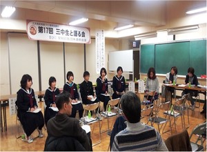 三中生と地域・保護者の方が設定されたテーマをもとに意見交換しました。保護者や地域の方々と中学生が互いに理解を深める機会としました。