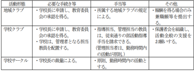 クラブ化には、現段階として二つの方法が考えられます。指導面だけでなく、管理面も地域団体等に任せる「地域クラブ」に移行させる方法と、管理面は学校が行う「学校クラブ」に改革する方法があります。