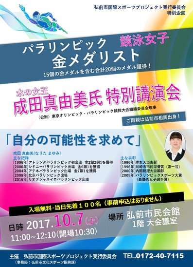 このたび、パラリンピック競泳種目で15個の金メダルを含む合計20個のメダルを獲得し、現在も第一線のスイマーとして進化を続ける障がい者スポーツ界のレジェンド、水の女王こと成田真由美氏を講師にお招きし、特別講演会を開催します。