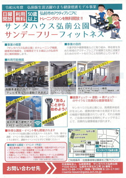 このたび、当市と連携して事業に取り組んでいる社会福祉法人弘前豊徳会において、50歳以上のアクティブシニアを対象に、サービス付き高齢者向け住宅「サンタハウス弘前公園」1階の健康測定機器やトレーニング機器を日曜日限定で無料開放することになりました。同施設1階には地域交流スペースもあり、今後、アクティブシニア向けの様々な講座・イベント等も開催予定です。