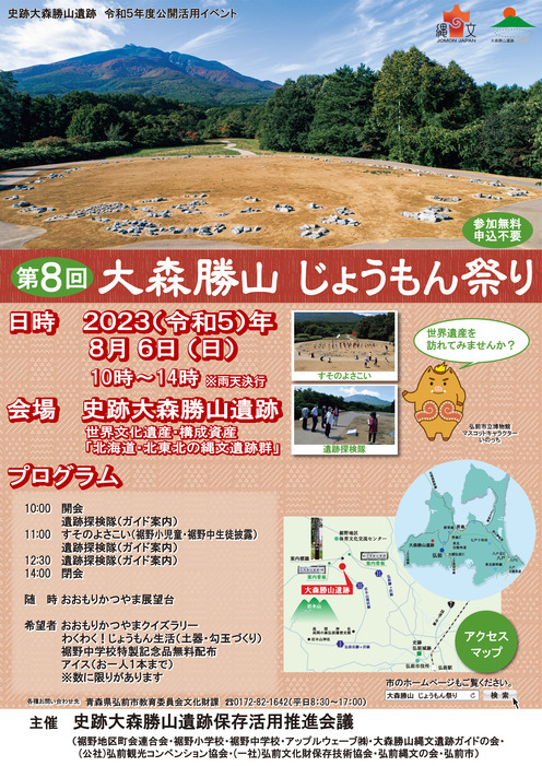 平成25(2013)年度に、地元町会、地元小・中学校、民間団体・企業、市で構成される「史跡大森勝山遺跡保存活用推進会議」が発足しました。毎年夏には、遺跡を舞台に「大森勝山じょうもん祭り」が開催されており、今年で8回目の開催となります。