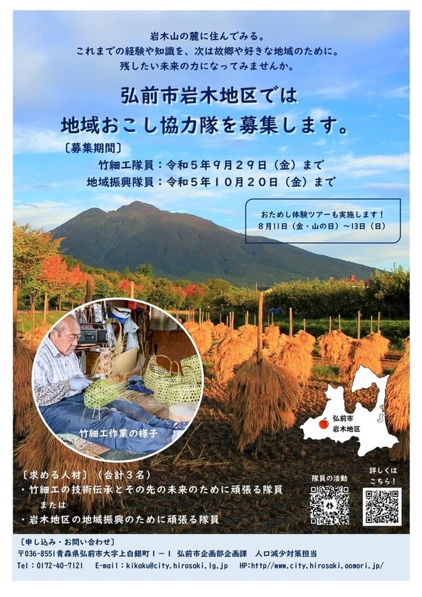 内容:おためし地域おこし協力隊(岩木地区体験ツアー)の参加者募集の説明会を兼ねた、地域おこし協力隊の募集説明会です。