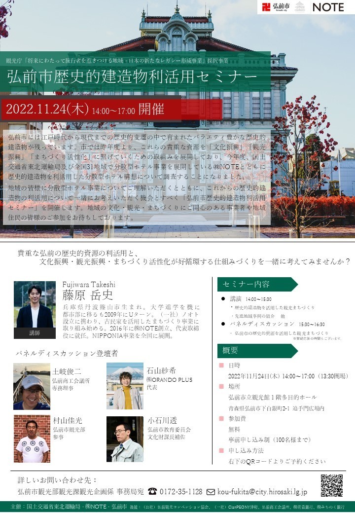 本セミナーはその一環として、地域の文化・観光・まちづくりに関係・興味関心のある事業者や地域住民の皆様を対象に、歴史的資源の利活用による地域課題の解決に向けた機運醸成を図ることを目的に開催します。
