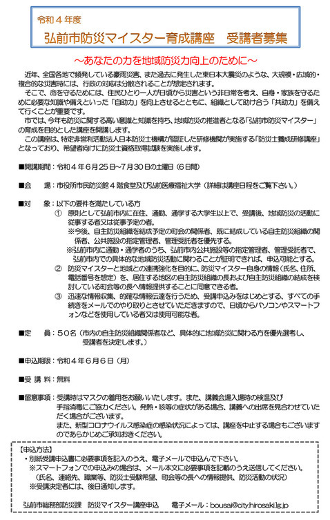 令和7年度弘前市防災マイスター育成講座受講者の募集を開始しました。