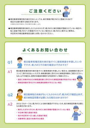 軽自動車税納付確認システム(軽JNKS)の運用開始に伴い、継続検査(車検)時の納税証明書の提示が原則不要になったため、これまで口座振替で軽自動車税を納付された方へ送付していた、軽自動車税(種別割)領収証書および納税証明書の発送は、令和7年度から廃止します。