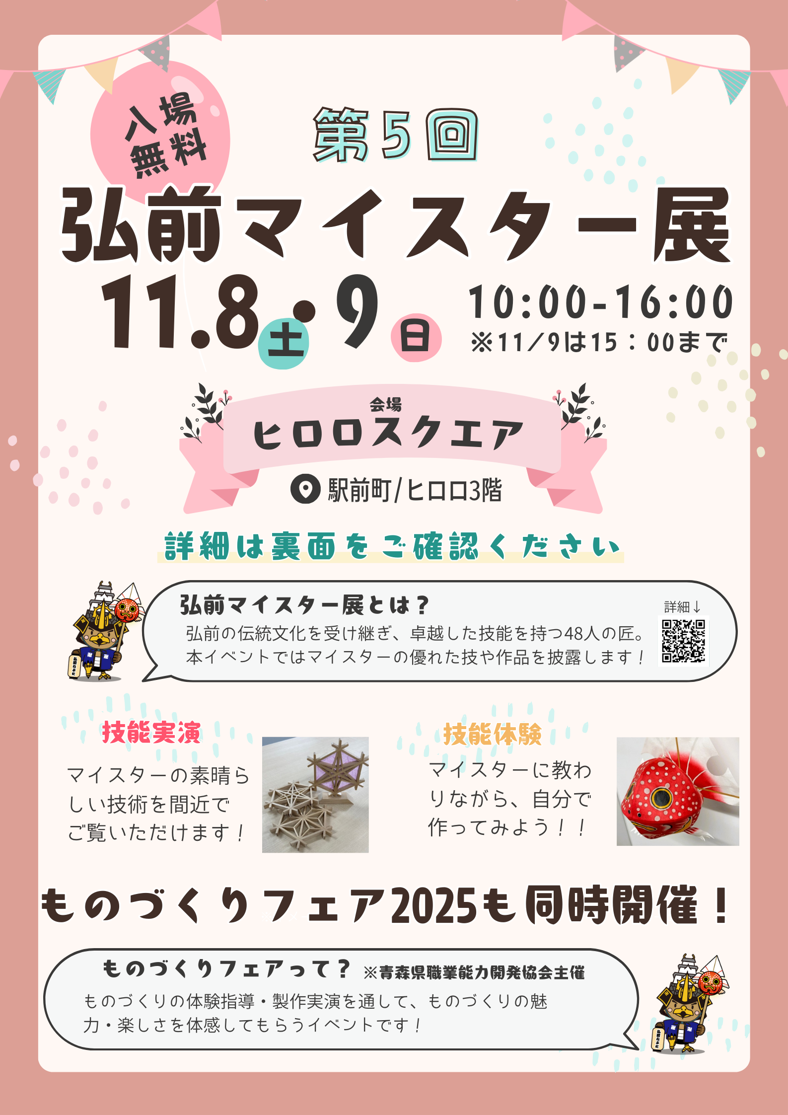 このたび、これまで認定を受けたマイスター48名の概要や技術を紹介するため、以下のとおり弘前マイスター展を開催します。