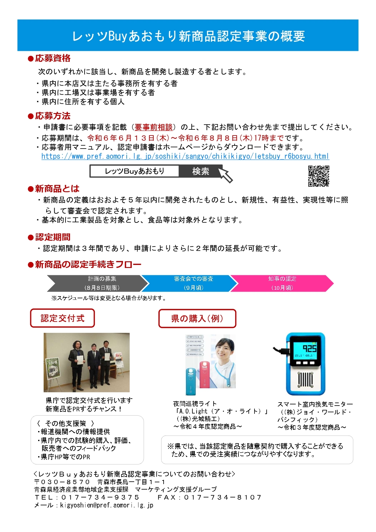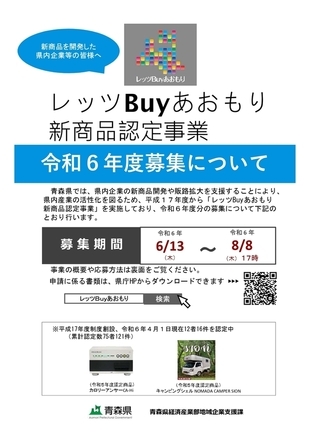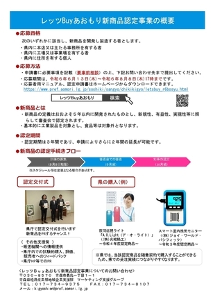 県内企業等が開発し製造した新商品を「レッツBuyあおもり新商品」として認定し、PRを行うとともに、県が試験的に購入し、受注実績を作ることで、県内企業等の新商品開発や販路拡大を支援する、青森県の制度です。