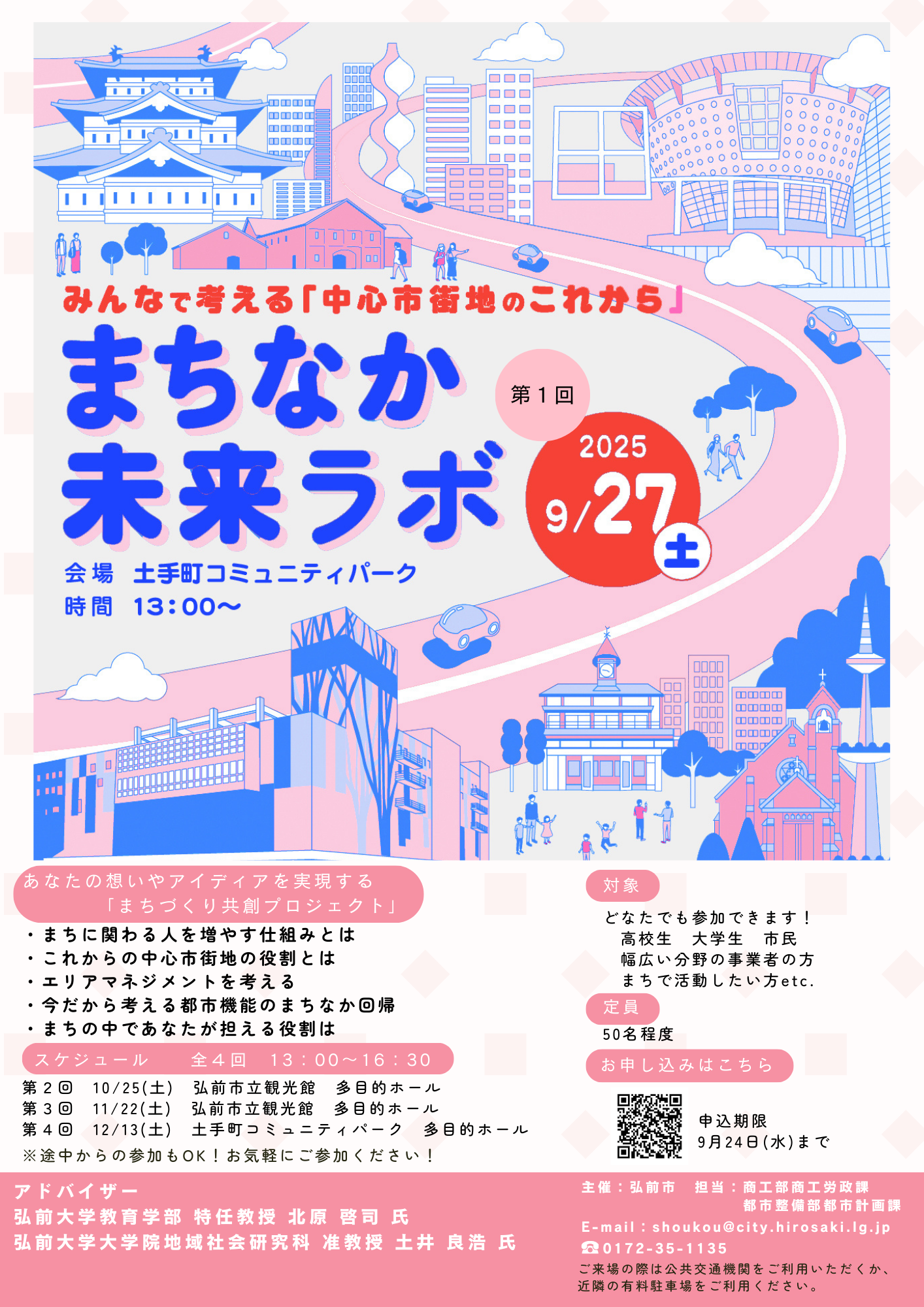 弘前市では、中心市街地の活性化に向けて、第3期弘前市中心市街地活性化基本計画の策定を進めております。このたび、今後のまちなかのあり方を考えながら、参加者のアイディアや事業構想の具現化を目指す「まちなか未来ラボ」を開催します。まちなかでやりたいことがある方、まちなかに想いがある方など、多くの皆様のご参加をお待ちしております。