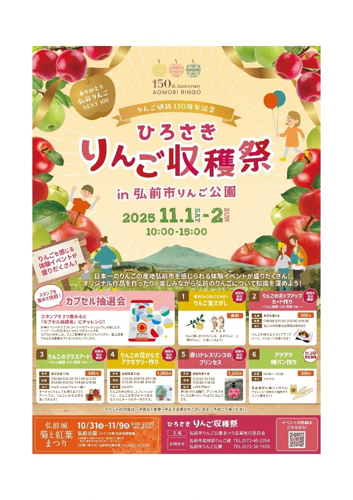 今年は、りんご植栽150周年をテーマとしたクイズやカプセル抽選会のほか、地元の団体によるステージイベントやりんごにちなんだ体験コーナー、りんごフードフェス、りんごマルシェなどりんごにちなんだ各種イベントを行います。ご家族やお友達とぜひ一緒に楽しくお過ごしください。