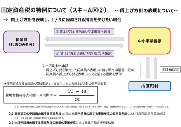 1.5%以上の賃上げ表明されたもの:3年間、課税標準を1/2に軽減 3%以上の賃上げ表明されたもの :5年間、課税標準を1/4に軽減 ※令和9年3月31日までに取得した設備 ※新規申請時に賃上げ表明を行っていれば、その後の変更申請時に改めて賃上げ表明を行うことが可能です。 |